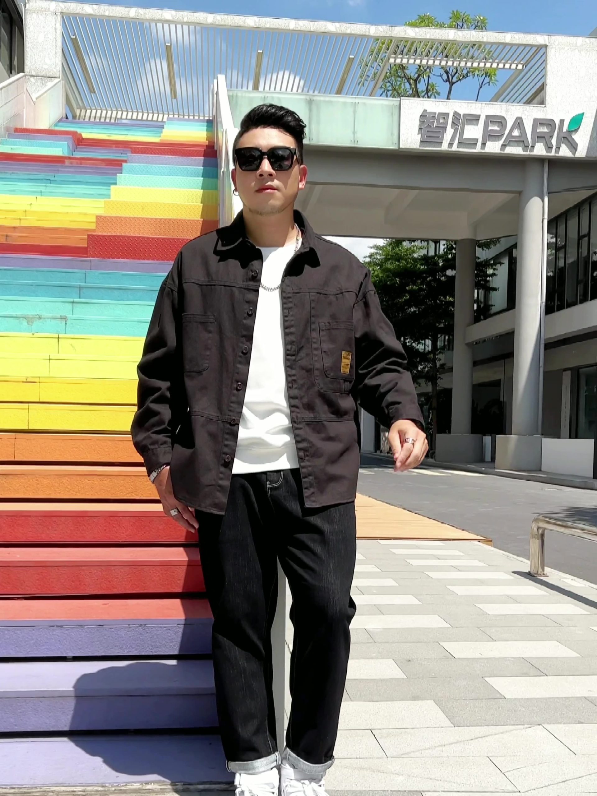 • Năng động: Khoác ngoài áo thun, quần short và giày sneaker.